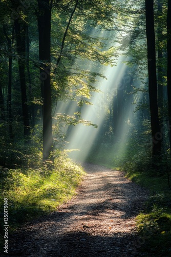 © Watcher, Fototapeta premium Sunbeams in Forest Path
