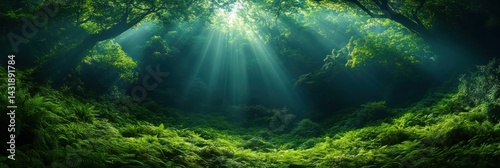 © aan, Fototapeta premium Sunbeams in Lush Forest.