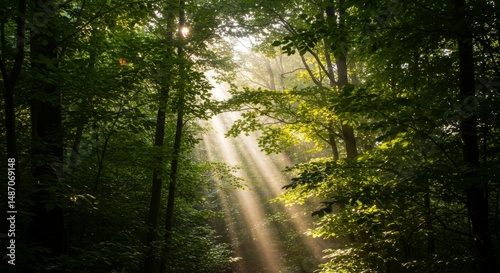 © Febi, Fototapeta premium Sunbeams in Lush Green Forest