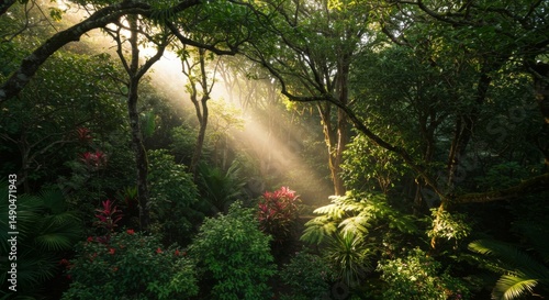 © SweaterWeather, Obraz premium Sunbeams in Lush Green Forest