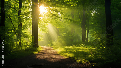 Obraz premium Sunbeams in Lush Green Forest