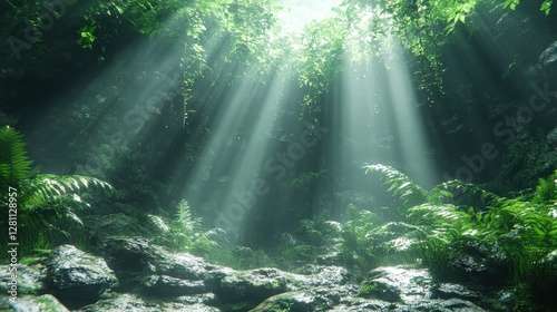 © angga, Fototapeta premium Sunbeams in lush rainforest cave
