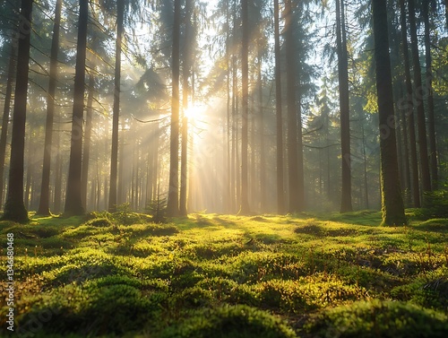 © Aodne, Obraz premium Sunbeams in Misty Forest.