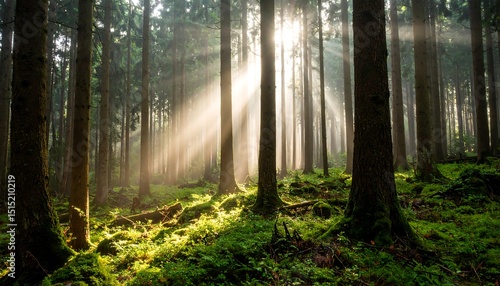 © Akun, Obraz premium Sunbeams in Misty Forest.