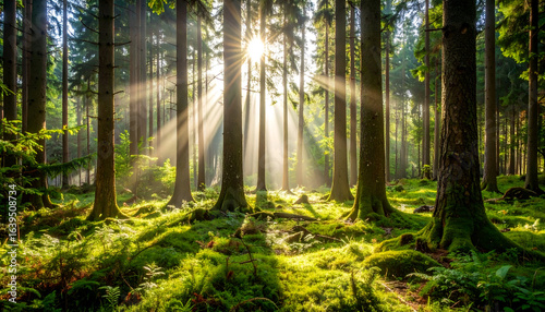 Obraz premium Sunbeams in Misty Forest. (6)