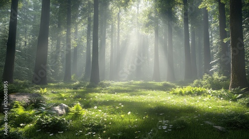 Naklejka premium Sunbeams in misty forest, tranquil path, lush greenery, nature scene, perfect for relaxation