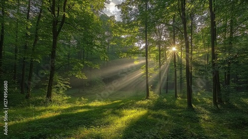 Fototapeta premium Sunbeams in Misty Green Forest Nature Trees Sunlight Landscape