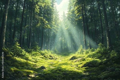 © Imam, Fototapeta premium Sunbeams in mossy forest path