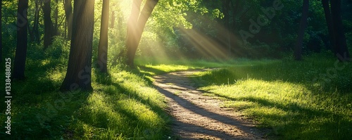 Fototapeta premium Sunbeams lighting forest path at sunrise