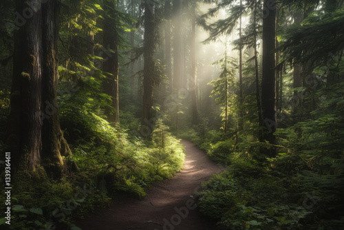 © Dejana, Fototapeta premium Sunbeams lighting mossy path through lush primeval forest