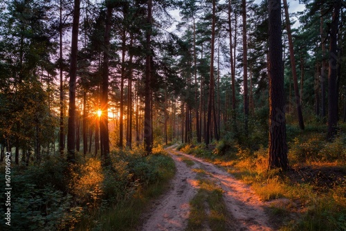 Obraz premium Sunbeams on a forest path at sunset