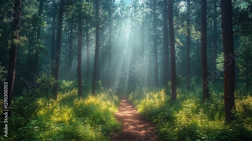 © HENNYSURYA, Obraz premium Sunbeams Path in Misty Forest