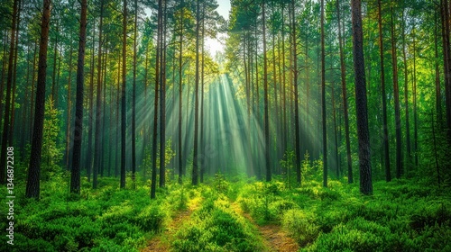 © mochiro, Obraz premium Sunbeams pierce a dense forest