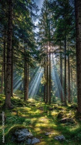 Obraz premium Sunbeams pierce a dense forest