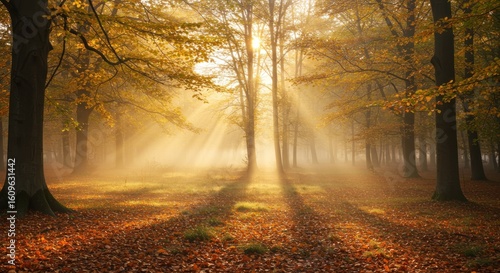 © fabrian, Fototapeta premium Sunbeams pierce a foggy autumn forest illuminating fallen leaves