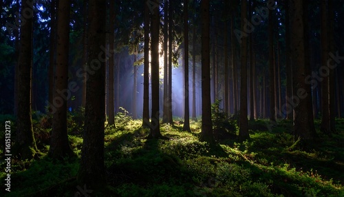 © Hilda, Fototapeta premium Sunbeams pierce a misty, dark forest, illuminating the mossy undergrowth