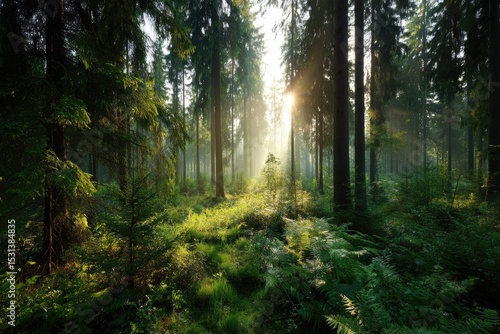 Obraz premium Sunbeams pierce a misty forest (1)