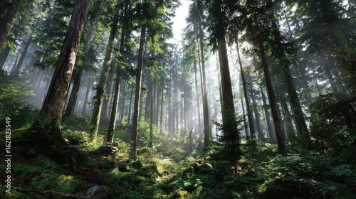 © Jolodong, Obraz premium Sunbeams pierce a misty forest (1)