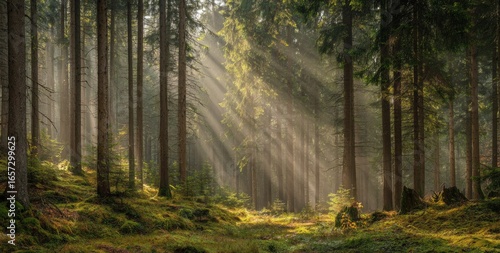 © Tas, Obraz premium Sunbeams pierce a misty forest