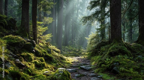 © Erisna Yolanda, Obraz premium Sunbeams pierce a mossy forest path