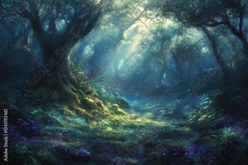 Obraz premium Sunbeams pierce a mystical forest, illuminating moss-covered ground and...