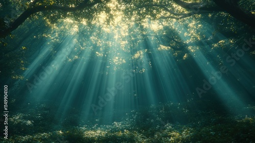 © Ali, Obraz premium Sunbeams pierce dark, lush forest canopy.
