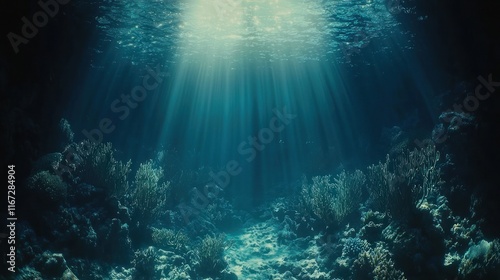 Fototapeta premium Sunbeams pierce deep ocean, illuminating coral reef seabed.