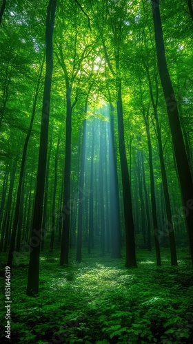 Naklejka premium Sunbeams pierce dense, green forest canopy, illuminating forest floor