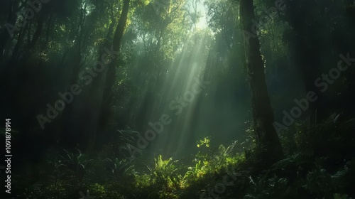 Obraz premium Sunbeams pierce dense rainforest canopy.