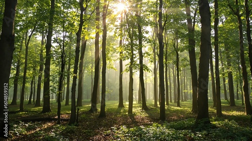 Obraz premium Sunbeams pierce lush green forest canopy creating a tranquil, magical woodland atmosphere