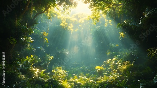 Fototapeta premium Sunbeams pierce lush jungle canopy, vibrant foliage, mystical background, nature scene