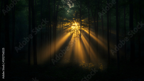 © wildan, Fototapeta premium Sunbeams pierce misty forest