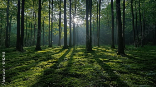 Obraz premium Sunbeams pierce misty forest floor (2)