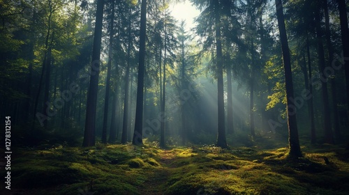© Arc std., Obraz premium Sunbeams pierce misty forest, illuminating mossy path.