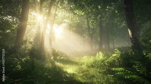 © Bebek, Obraz premium Sunbeams pierce misty forest path