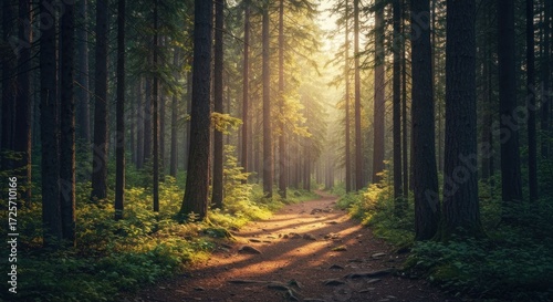© andi, Naklejka premium Sunbeams pierce misty forest path