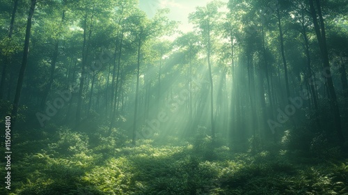 © Ali, Obraz premium Sunbeams pierce misty, green forest.
