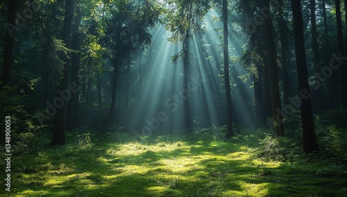 Fototapeta premium Sunbeams pierce through a dense forest, illuminating a lush green carpet of...