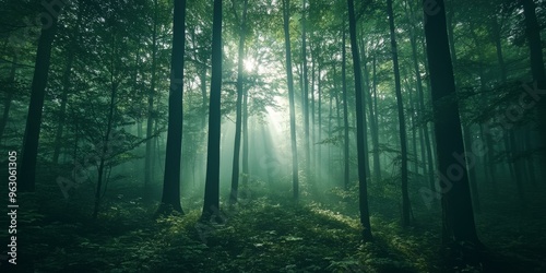 © Murda, Fototapeta premium Sunbeams pierce through a foggy forest.