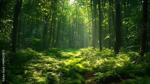 © Raitalinn, Obraz premium Sunbeams pierce through a lush forest canopy, casting a golden glow.
