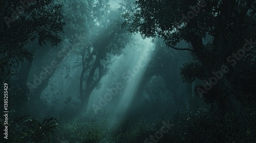 © Ikhsan, Obraz premium Sunbeams pierce through a misty, dark forest.