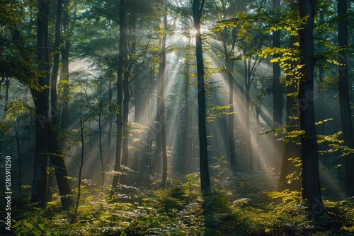 Fototapeta premium Sunbeams pierce through a misty forest, illuminating the lush green undergrowth and tall trees.