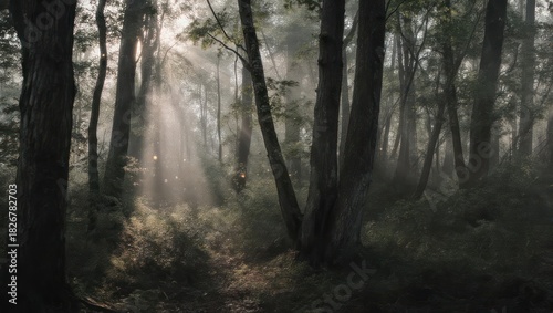 © Sayyid, Obraz premium Sunbeams pierce through misty forest canopy illuminating a woodland path.