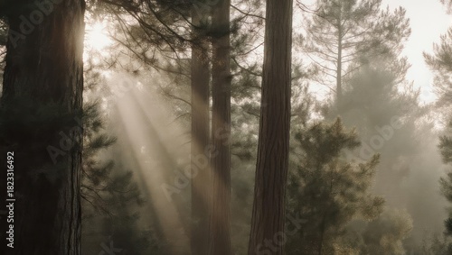 © Faizal, Obraz premium Sunbeams pierce through misty forest canopy illuminating ancient trees.
