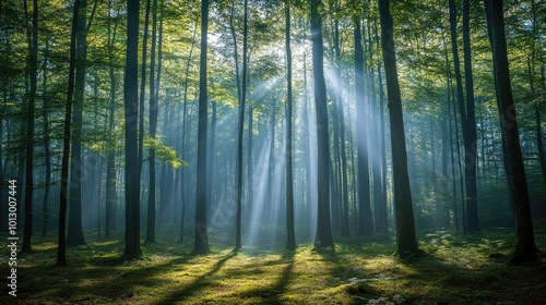 Fototapeta premium Sunbeams pierce through misty forest. Perfect for nature, tranquility, and...