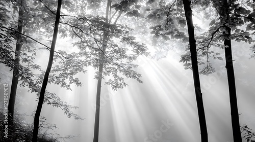 Obraz premium Sunbeams pierce through misty forest trees