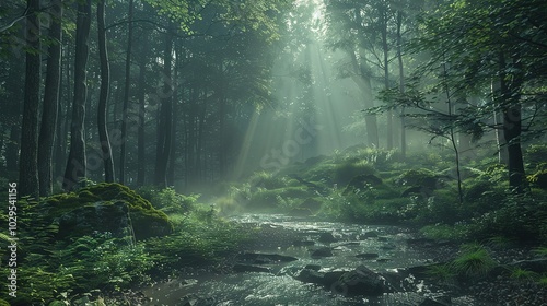 Fototapeta premium Sunbeams pierce through the canopy of a lush, misty forest, illuminating a stream winding through th