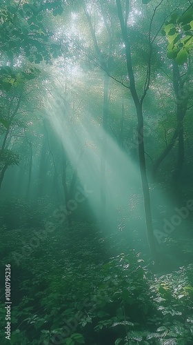 Obraz premium Sunbeams pierce through the fog in a dense, green forest.