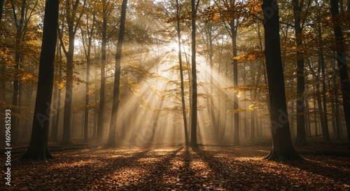 © fabrian, Fototapeta premium Sunbeams pierce through trees in an autumn forest