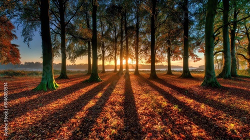 Fototapeta premium Sunbeams pierce through trees onto an autumn forest floor.